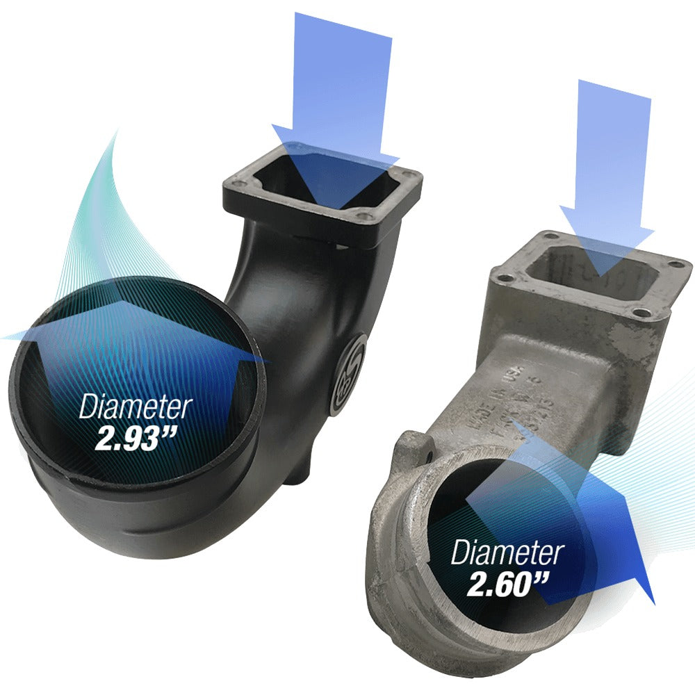 Le coude S&B est plus grand que celui d'origine. Son diamètre plus large permet un meilleur flux d'air, ce qui se traduit par une puissance et des performances accrues.