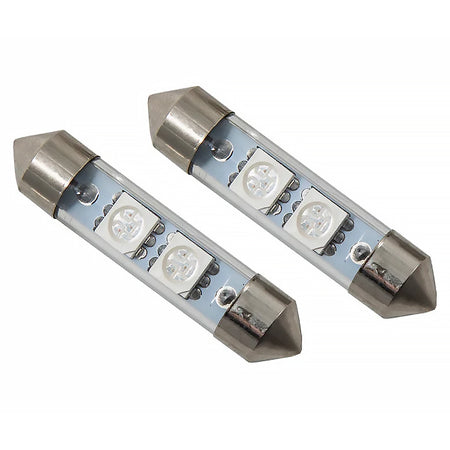 Features Direct replacement for factory 39mm festoon bulb Adds more modern LED appearance Plug and play simple installation Overview Design. The 39mm SMF2 LED bulb is a direct replacement for any 39mm-size bulb commonly found in vanity mirror lights in many vehicles. Populated with two 5050-size SMDs the SMF2 upgrades the factory yellowish incandescent bulb to a more modern LED appearance while adding far more total light output than the factory bulb. The SMF2 was designed with an embedded load resistor and implanted diode for superior reliability. With its durable metal terminals it will fit snugly in the socket and its light weight means it won't vibrate loose over time. Reliability. Unlike other bulbs on the market this bulb is built with constant-current circuitry along with transient suppression. That means this bulb will last for years not months with no flickering or failure. And like every Diode Dynamics product it's backed by an industry-leading three-year replacement warranty. Brightness. With 24 lumens of true measured output the SMF2 LED will provide about double the total light compared to your original 39mm-sized bulb. All Diode Dynamics LED lighting is rated with accurate measured lumen figures not calculations or guesses. We test the true output in-house and provide you the real numbers to compare. Colors. In addition to vibrant colors of blue red amber and green the SMF2 is available in a cool white 6000K and warm white 3000K option as well. Whether you want a modern cool white appearance or a traditional warm white color we have the color to fit your need!