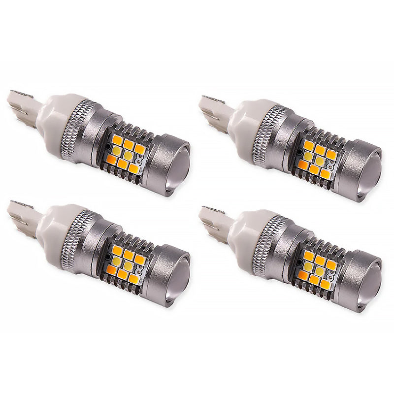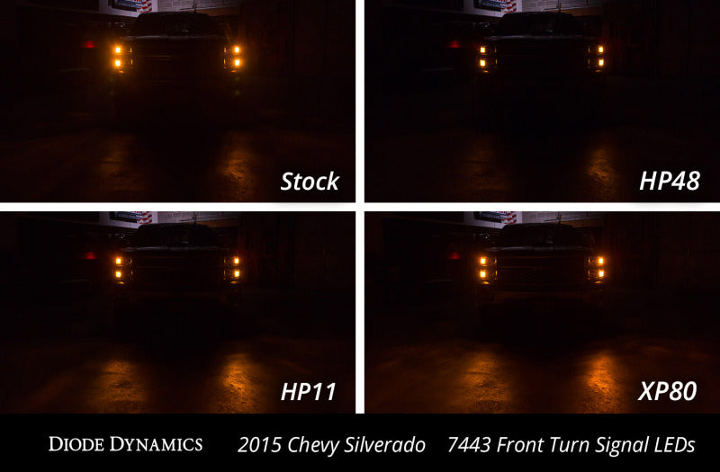 Features Direct replacement for factory incandescent 7440/7443-size front turn signal bulb. Adds cool white running light along with amber turn signal. High-power Samsung LEDs arranged around the bulb. No yellow appearance when switched off. Fully aluminum construction. Non-polar and CK compatible. Plug and play simple installation. Overview Upgrade. Add dual-color functionality and a modern appearance to your front turn signals with the 7440/7443 HP24 turn signal bulb. Populated with sixteen amber chips and eight white chips this bulb lights up white when your headlights are turned on and flashes amber when the turn signals are activated. Housed in an aluminum casing for maximum heatsinking properties the HP24 will last for years to come. Best of all installation only takes minutes - simply take out your factory bulb and the HP24 will fit snugly in the socket. The HP24 bulb is only suitable for vehicles that have a clear front turn signal reflector lens. Brightness. At 410 lumens the HP24 will provide about double the total light output compared to your factory bulb. All Diode Dynamics LED lighting is rated with accurate measured lumen figures not calculations or guesses. We test the true output in-house and provide you the real numbers to compare. Reliability. Unlike other bulbs on the market this bulb is built with constant-current circuitry along with transient suppression. That means this bulb will last for years not months with no flickering or failure. And like every Diode Dynamics product it's backed by an industry-leading three-year replacement warranty.