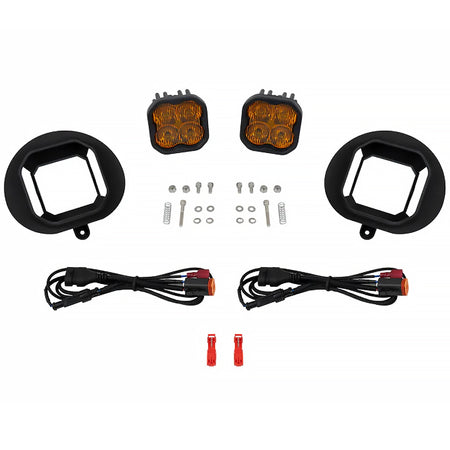 FeaturesAdvanced TIR optics provide high efficiency and focusSAE-compliant road-legal outputIncludes one-piece 3D-printed bezel and bracket for factory-style appearancePlug and play no modification neededEngineered and Assembled in USAOverviewOverview. Upgrade your fog lights with our SS3 Type Sierra Fog Light Bracket Kit! Featuring higher output intensity than any other 3in light on the market these LED pods have been designed for maximum functionality with custom-engineered TIR optics shining in highly useful beam patterns all in a durable package. With the included round bezel the SS3 Fog Kit has a clean factory-style appearance only much brighter! This kit includes custom 3D-printed brackets designed and produced by Foxbeam Lighting.Plug and Play. Thanks to 3D-printed brackets the SS3 Fog Light Bracket Kit can be installed on your vehicle in minutes. Simply remove your factory fog light assembly and ours will bolt right in its place! Wire adapters are included with the kit allowing you to connect the lights to your factory bulb sockets - no additional wiring needed!Backlight Functionality. The Stage Series 3in LED Pod features a distinctive backlight in a brilliant amber color. This integrated backlight gives you an additional accent light along with the main beam. The SS3's backlight fully illuminates the TIR optic providing a more unique and modern look than the small indicator LEDs found in other products. To power the backlight use the included harness to tap your desired vehicle function.SAE Compliant. When installed as a pair and aimed in accordance with your state's regulations the Fog pattern meets SAE J583 standard as a Foglamp for legal on-road use.