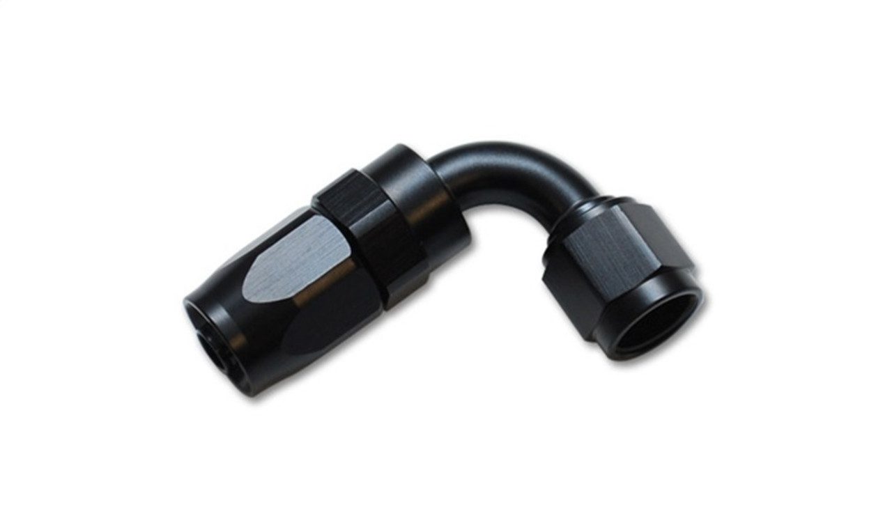 Vibrant Performance -4AN 90 Degree Elbow Hose Swivel-Style Hose End Fitting deliver the type of quality, reliability, smooth flow and ease of assembly that industry professionals demand. Made from 6061 Aluminum Alloy, these lightweight fittings are suitable for use in oil, fuel, coolant and vacuum applications and feature double PTFE O-Ring seals for leak-free service when installed properly. Our signature Double Anodized and Polished finish delivers remarkable color consistency from one batch to the next. Available in Black Hard Anodized finish only.